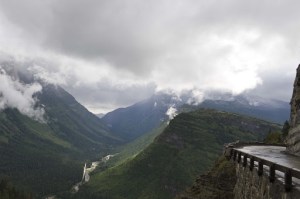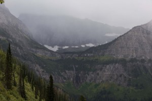 After the cruise, the real part of the drive in the park began – Going to the Sun Road. What an experience!! The road is much like ‘the road to Hana’ in Hawaii for those of you who have been there. Narrow and winding – and straight down a cliff if you go off the side! But the scenery is stunning. We had a wonderful benefit of the weather – everything from rain, sleet, hail, snow, cold, clouds, sun and whatever else you could think of in a three hour period – it provided some incredible lighting and effects. Especially as we viewed the ‘orphaned remnants’ of the glaciers and the associated waterfalls across the valley. BEAUTIFUL! (The only thing is that I was driving again so Gary could take the pictures.)