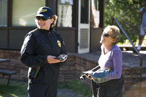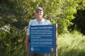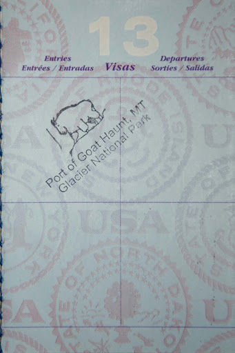 Now, when you get to the end of the lake you disembark and have the opportunity to visit the US ‘Customs and Immigration of Goat Haunt’ (the ridge above is a local hangout/haunt of the goats). Remember I said we passed from Canada into the US while on the boat. If you plan to go into the back country hiking, you must pass through this customs and immigration check point (if ‘just visiting’ off the boat and returning immediately to Canada on the boat, you do not have to technically go through the check point). So, there is no ‘sneaking’ into the US by hiking in! As you can see below, I had to beg and plead with the customs agents not to detain me – but, just give me a stamp in my passport!! And, a great stamp it is of a goat – what else?!?! Perhaps you had to be here, but the whole set up of this ‘out post’ customs and immigration check point on a hiking trail out in the middle of no where was fascinating to me. I must say – the agents here were VERY friendly and really good sports when I started the stamp thing – as after I got mine there was a line up of everyone off the boat to do the same thing!! As you all know – I am ever the trouble maker!!