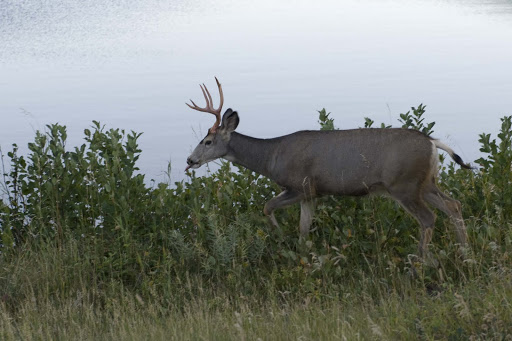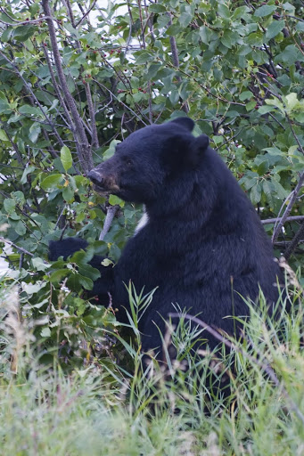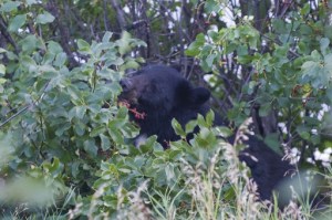 Well, it was now about 6:30 – just the right time to head up into one of the canyons for bear or moose sightings. AND, just on the edge of town what did we see – ONE HUNGRY BEAR!! YEAH!! We were soooooo excited to see this guy – we watched for over an hour as he worked his way down the line of berry bushes – he eats over 100,000 berries a day!! The bucks didn’t seem to care that he was there – and he didn’t care that they were there. Everyone was just out for dinner.