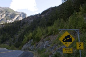 Sunday was a fabulous travel day! We took ‘the back way’ – or as the locals call it – ‘the Duffy Lake Road’ – from Kamloops to Whistler. It is only about 180 miles, but it took us 6 hours! We had been warned that the road was very steep and winding in places, but that trucks used it so we would be OK with Magic. For the most part, the road was good – only a few gravel/dirt spots. BUT, it was very narrow in spots with several one lane wooden bridges (wish we had a shot of these to show you – wow!) and lots of very steep places. Ever seen a 13% Grade?!?!?! We had several – and Magic performed just fine.