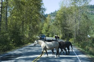 After taking it all in and having full stomachs, it was time to hit the road again. Most of the way it was open range, but we thought that was just for cattle. At one point it was the horses who created their parade – and didn’t care if they held up traffic!