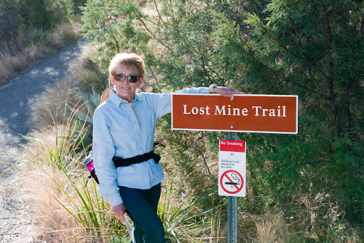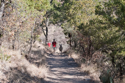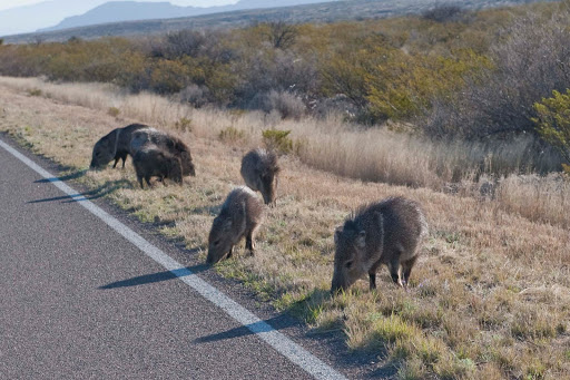 Despite the fact that we are not enamored with all the desert and sand here, we did have another hike we wanted to do in the Chisos Mountains. So, we postponed our departure from Big Bend by a day to hike the Lost Mine Trail in the Chisos area. On our drive in to the trail head, we came upon a family/herd of Javelinas having breakfast by the side of the road. Then when we got to the trail head, we had an escort of a couple of mule deer.