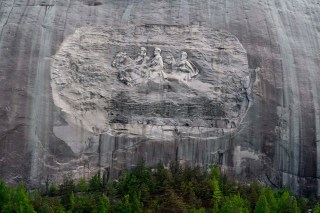 Of course, the highlight of Stone Mountain is the mountain itself and the ‘carving’ in the granite – a Confederate Mount Rushmore, which consists of the twenty-times-larger-than-life figures of Robert E. Lee, “Stonewall” Jackson and Jefferson Davis carved into an 800 foot high hump of granite. In the evening this carving ‘comes to life’ via a laser show and fireworks:-))