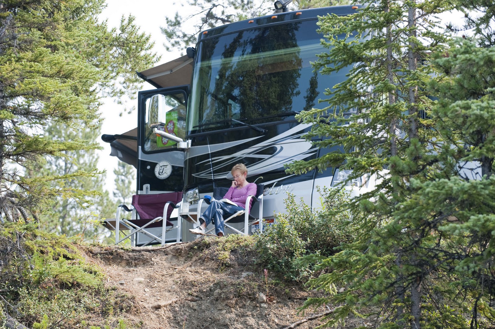 | Our reading room on Dease Lake for the next couple of days. The Waters Edge campground is very nicely maintained and we even have an internet connection until they turn their generator off at night. |