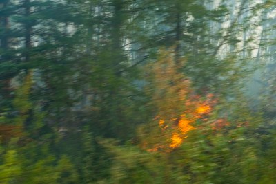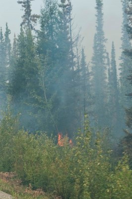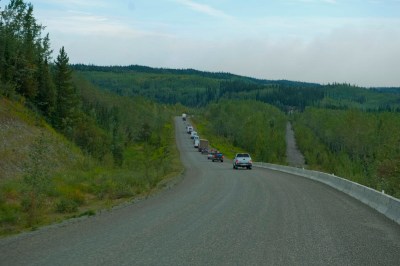 As mentioned above – we had about 30 miles to go before we even got close to the fire. Fortunately, even though the road was narrow it was good. AND, there was only traffic one way so we could drive down the middle. Even though we were in a convoy, we made good time. Then we hit the fire area, which extended for about 10 miles. It was smokey – and there were hot spots fairly close to the road;-(