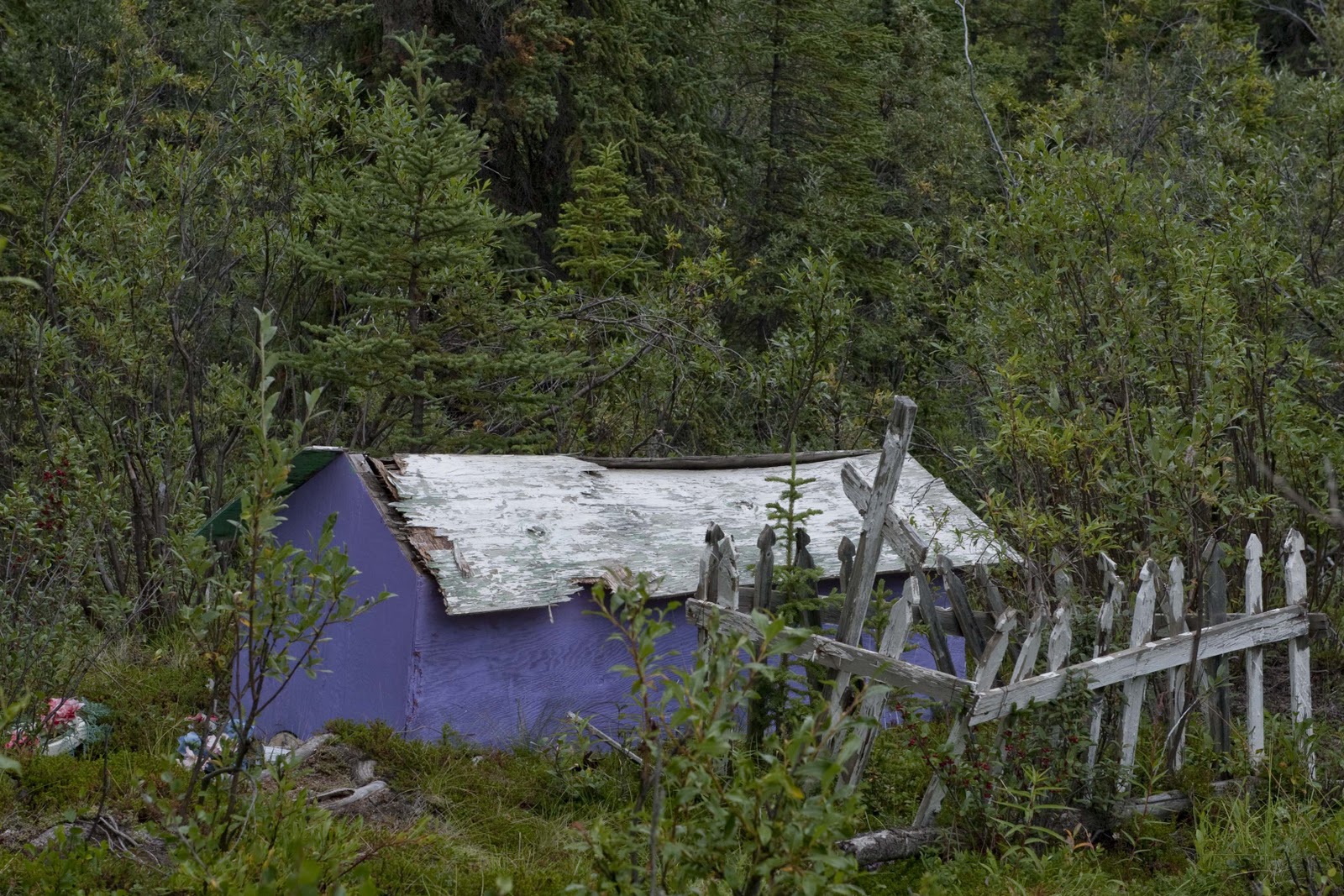 Along the old mine road we spotted this plywood crypt. No headstone or other identification, but you can see the flowers (I think they are artificial) on the left. |