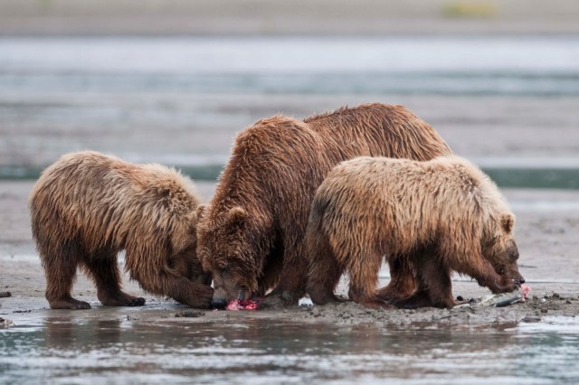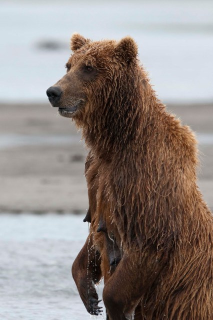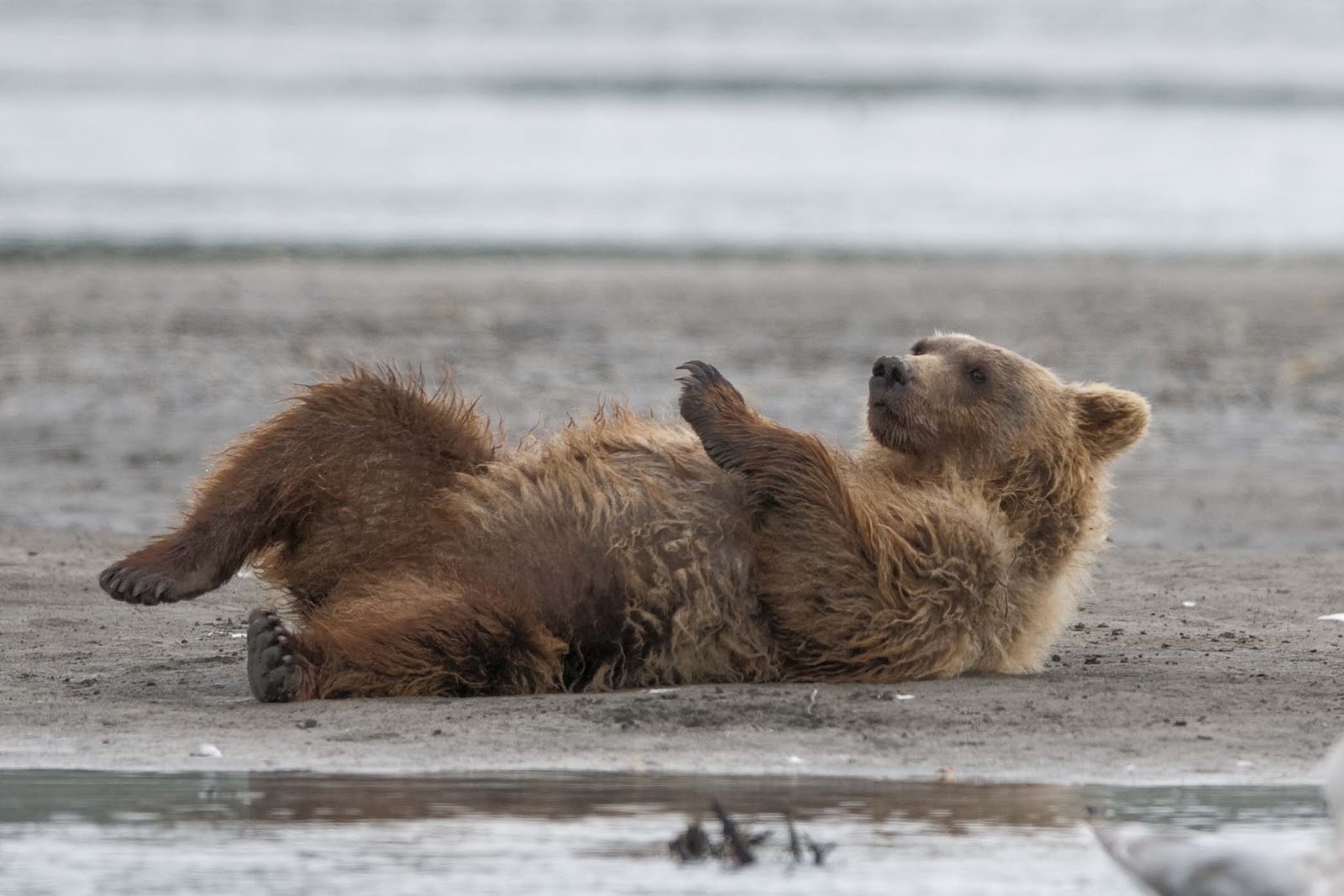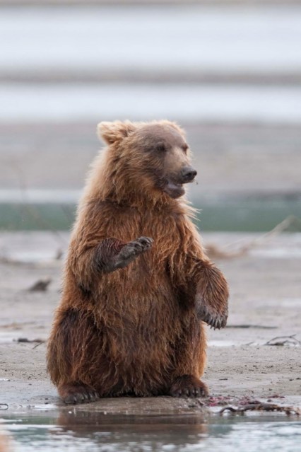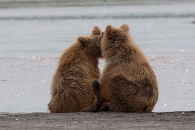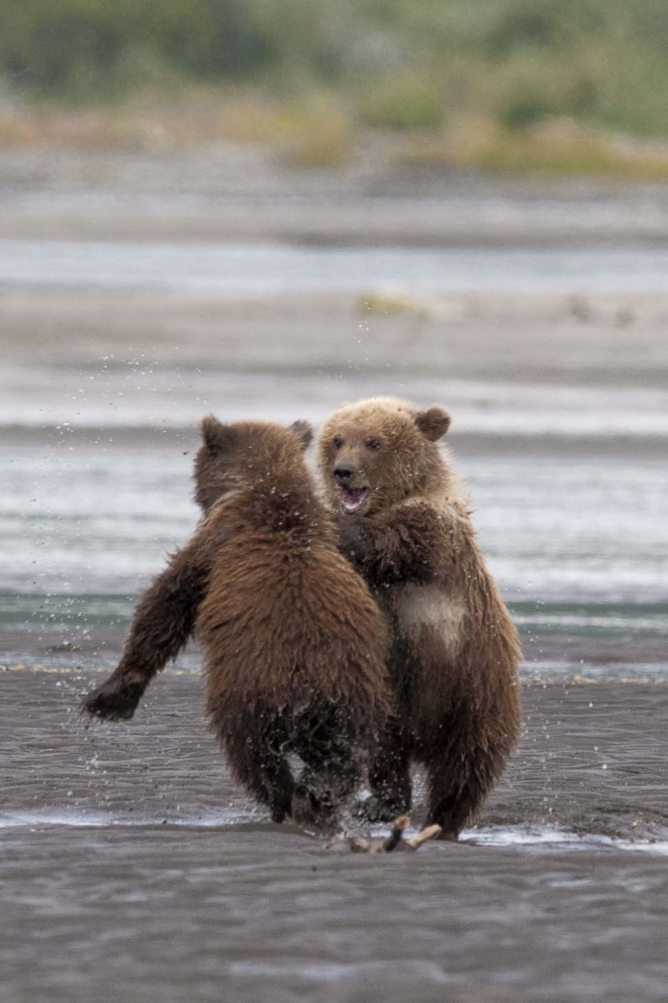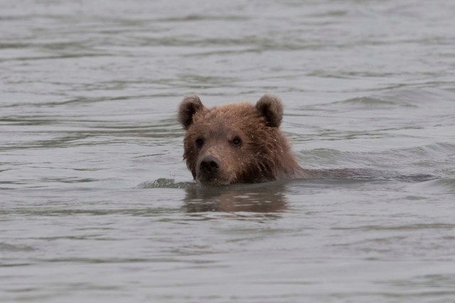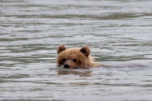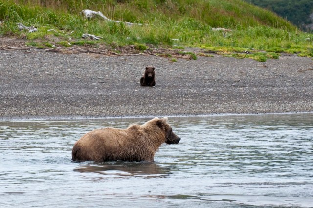 This Mama was a little lazy – she just dug up old fish that had become trapped in the sand – good and smelly so easy to find!! YUCK!! The best part of this family was watching ‘the kids’ float down the river to get to Mama and then wrestling with each other. That, and the fact that one of the cubs had a beautiful collar of lighter brown around its neck.
