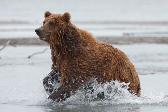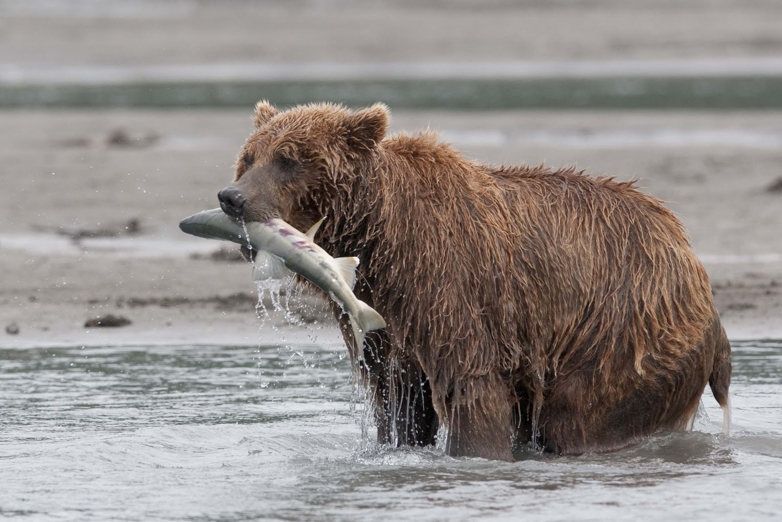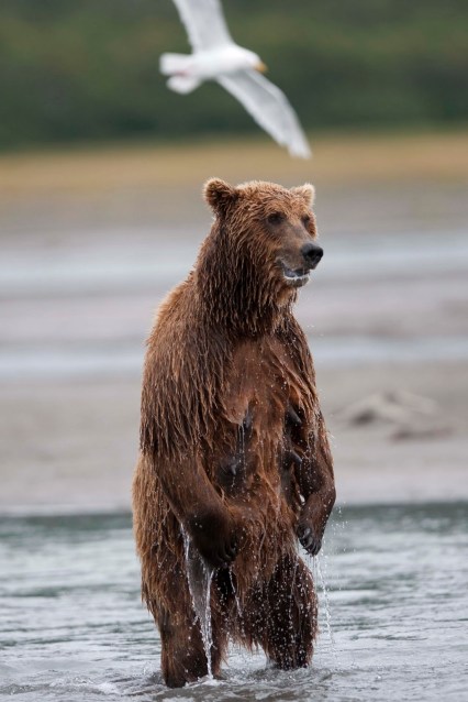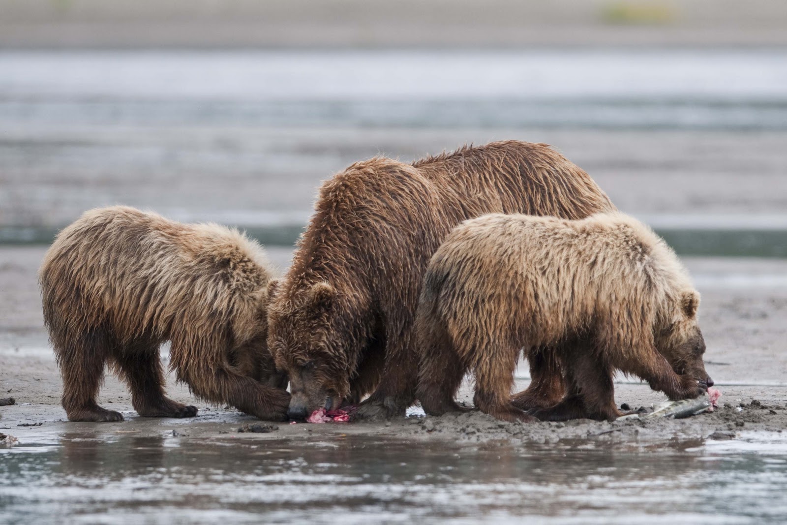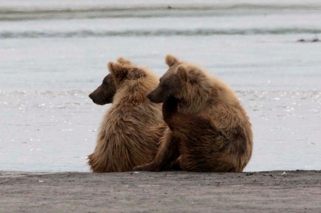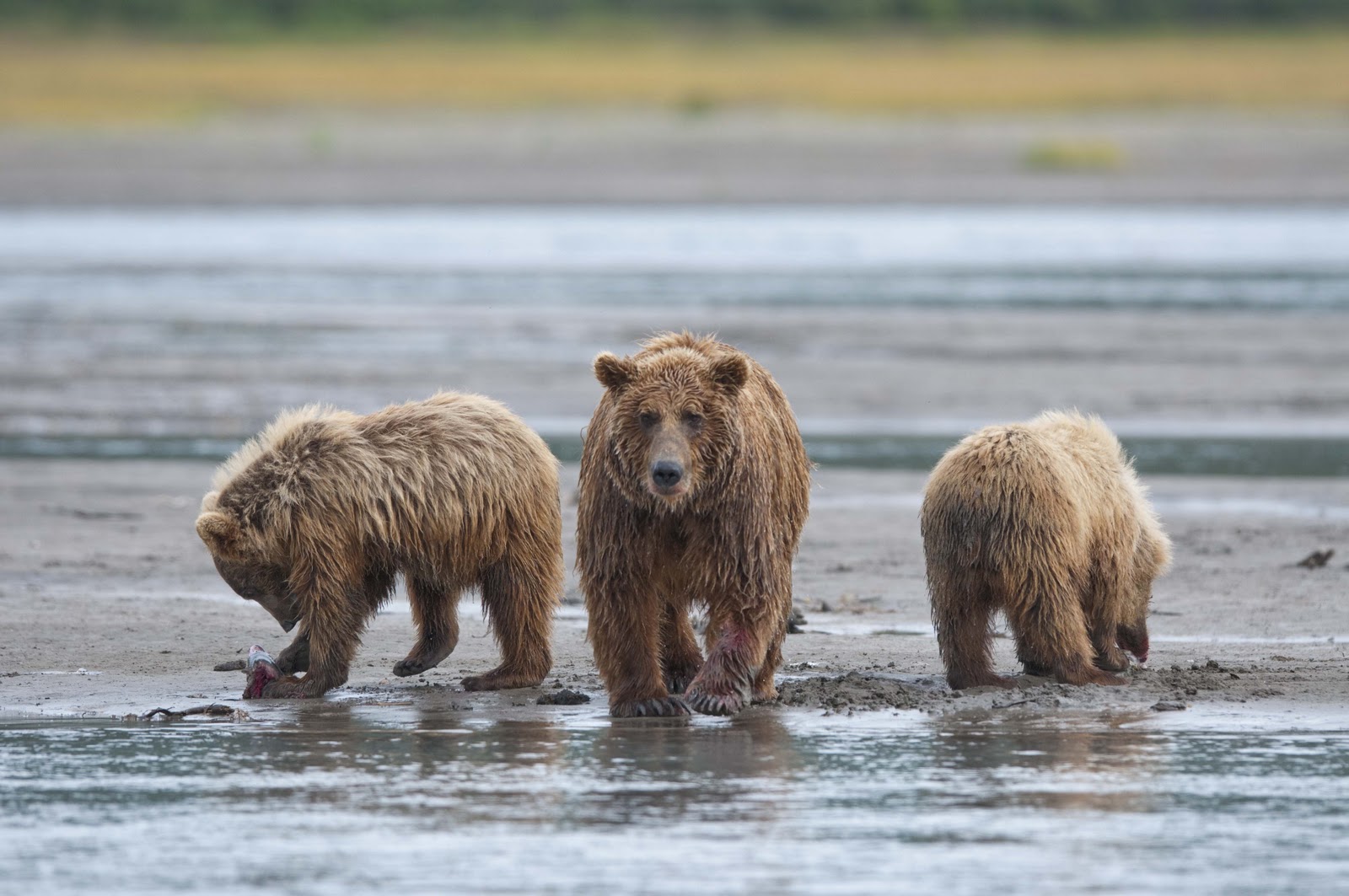 This Mama was a little lazy – she just dug up old fish that had become trapped in the sand – good and smelly so easy to find!! YUCK!! The best part of this family was watching ‘the kids’ float down the river to get to Mama and then wrestling with each other. That, and the fact that one of the cubs had a beautiful collar of lighter brown around its neck.