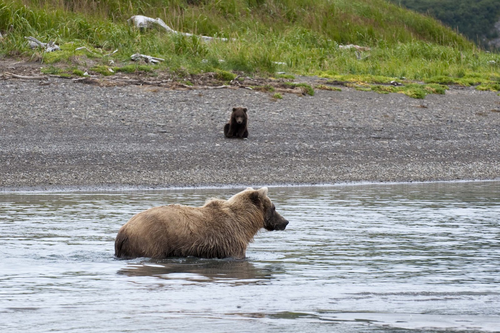 As Bad Mama moved on, “Good Mama” and her two bear cubs (probably about 18 months old – born the 2009 winter) became our study. Good Mama was a VERY proficient and efficient fisherwoman! She caught 7 fish in the hour we were watching her – only missed on about two attempts!! The first one she caught she took to the sand bar where the two cubs were – and they immediately jumped on the fish leaving her nothing. The next ones she caught she brought to the sand bar in the middle of the stream and made the cubs come out there if they wanted any. At least this way she got the first couple of bites. BUT, she always shared with the cubs. While she fished she kept an eye on their antics on the beach. She was a real study in fishing and we watched this ‘family’ for about an hour while eating our lunch.
