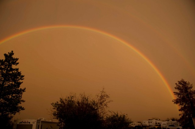 | As we settled into our campsite in Dawson Creek we encountered a weather front which brought with it heavy rain and a dust storm. It made for some interesting colors, a double rainbow, and |