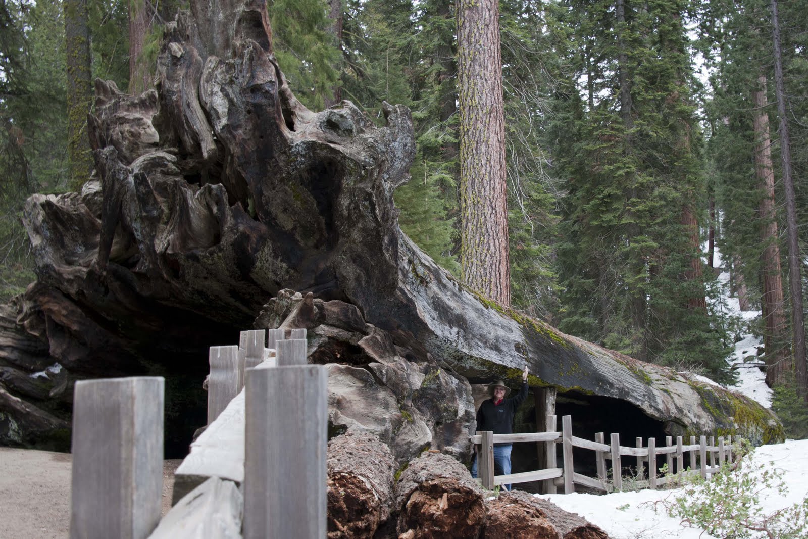 In all the world, sequoias grow naturally only on the west slope of the Sierra Nevada, most often between 5,000 and 7,000 feet of elevation. The giant sequoia has a massive trunk, huge stout branches, and cinnamon-colored bark. It grows to over 300 feet with a base over 40 feet in diameter (that is 6 Gary’s laid head to feet!!), branches to 8 feet in diameter and live over 3,200 years!! They don’t die. Chemicals in the wood and bark provide resistance to insects and fungi, and thick bark insulates them from most fire. The main cause of sequoia deaths is toppling. And, once they fall they remain forever on the forest floor as the chemicals in the wood also prevent rot.