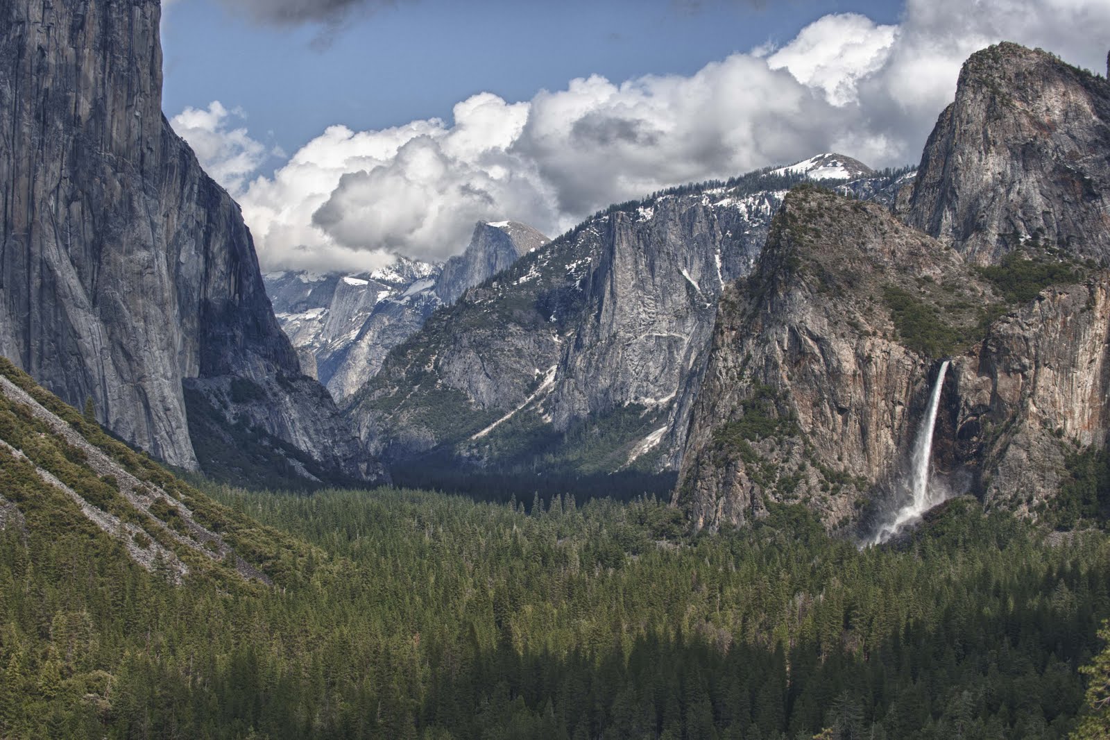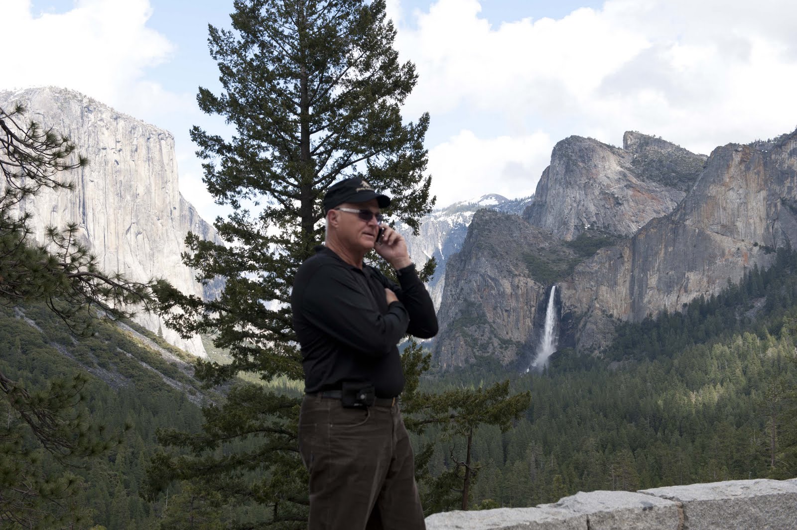 Just outside of the Valley is one of the most photographed vistas in the world. Here one gets a classic view of Yosemite Valley, including El Capitan (on the left), Clouds Rest (in the middle where the clouds are ‘resting’), Half dome (coming around clockwise), Sentinel Rock, Cathedral Rocks and Bridalveil Fall. We spent quit a bit of time here just taking in the sights! (Gary does get a little bit of slack for the phone thing — as he got an offer on his Mother’s house and was trying to move the deal along while there. This is a good thing.)