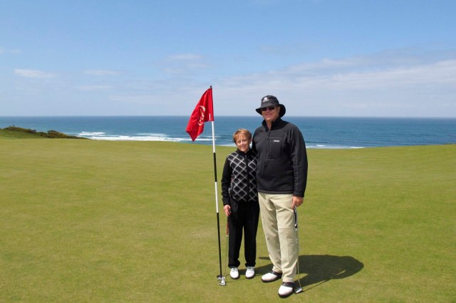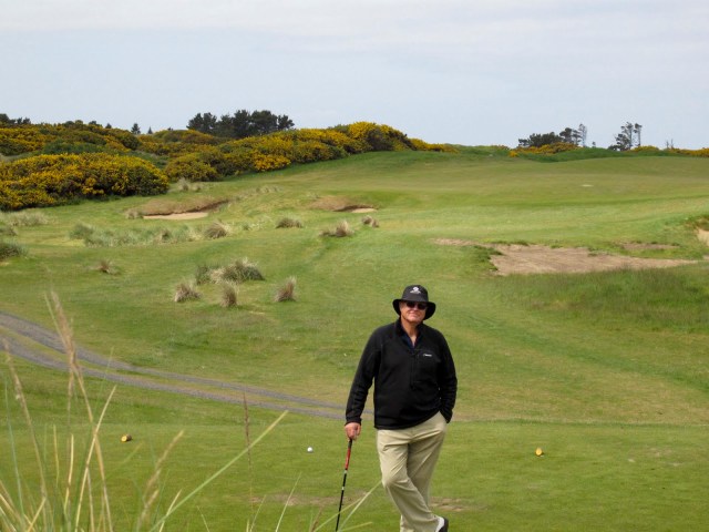 We had the most glorious day in terms of weather – some wind BUT NO rain or fog. Just beautiful blue sky with clouds passing by periodically. AND, more glorious – we had the entire course to ourselves!! Seriously, there was one other 4-some we saw once or twice. This course is visually stunning – especially as you walk up a sand dune from the men’s tee at the third hole (the men have a blind shot up and over the dune) to the women’s tee at the top of the dune. The whole rest of the course and the ocean open up before you! Unbelievably beautiful!!!! Even though we have a talented photographer traveling with us – the pictures do not do justice to the views – or our day –