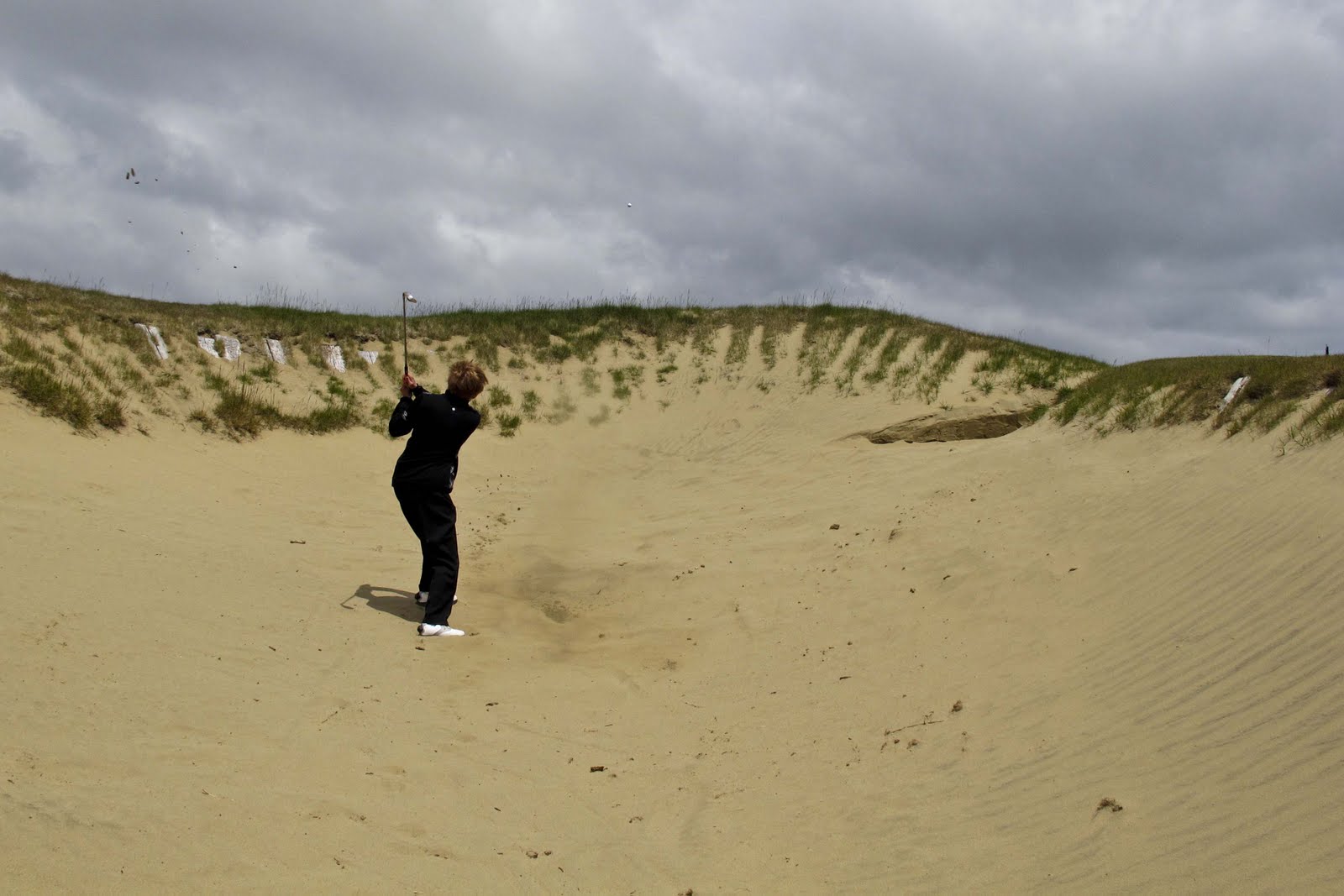| This bunker was one “big mutha”! Note Elizabeth’s ball flying safely out of the trap.. it landed on the green, near the hole. GREAT OUT!! |