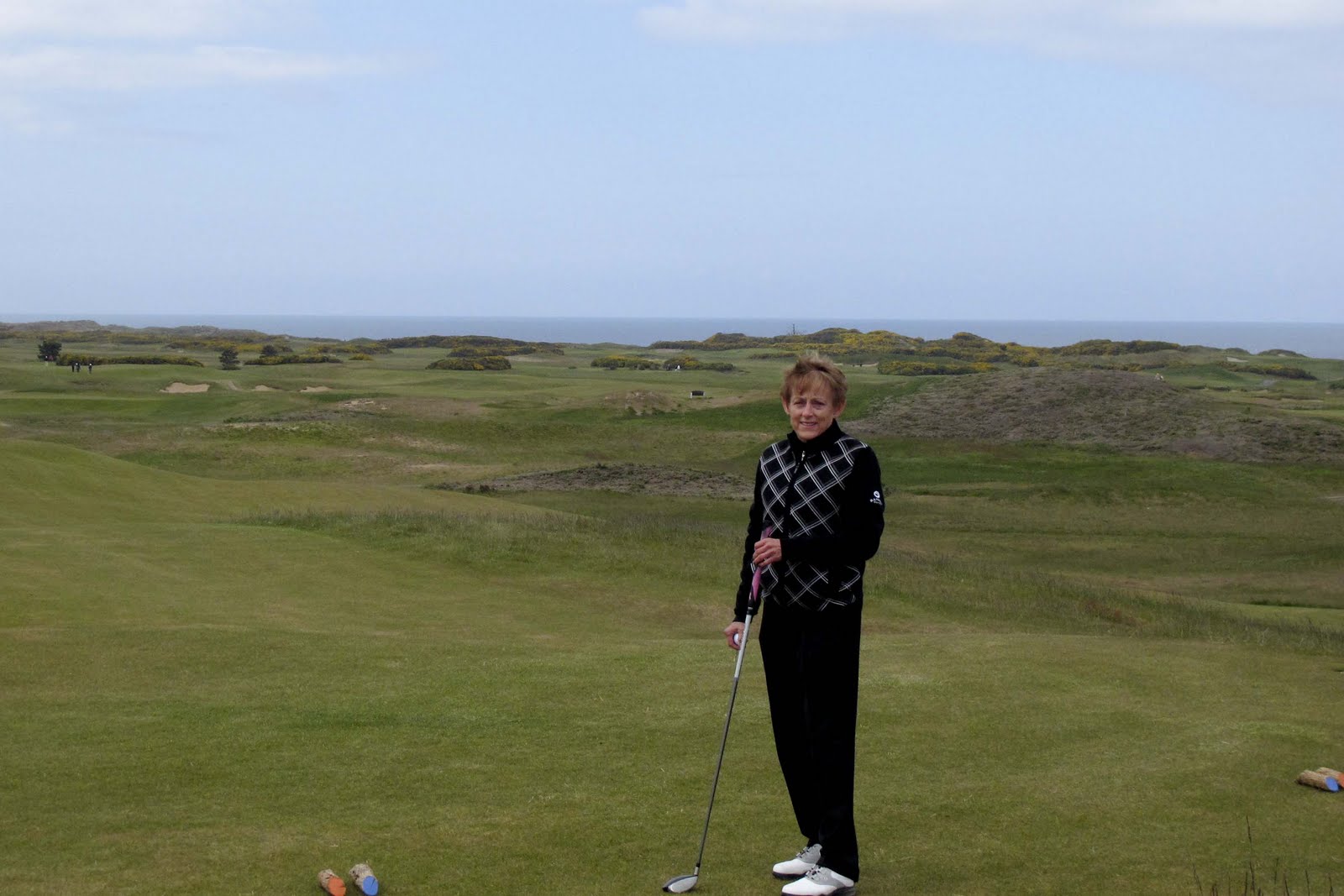We had the most glorious day in terms of weather – some wind BUT NO rain or fog. Just beautiful blue sky with clouds passing by periodically. AND, more glorious – we had the entire course to ourselves!! Seriously, there was one other 4-some we saw once or twice. This course is visually stunning – especially as you walk up a sand dune from the men’s tee at the third hole (the men have a blind shot up and over the dune) to the women’s tee at the top of the dune. The whole rest of the course and the ocean open up before you! Unbelievably beautiful!!!! Even though we have a talented photographer traveling with us – the pictures do not do justice to the views – or our day –