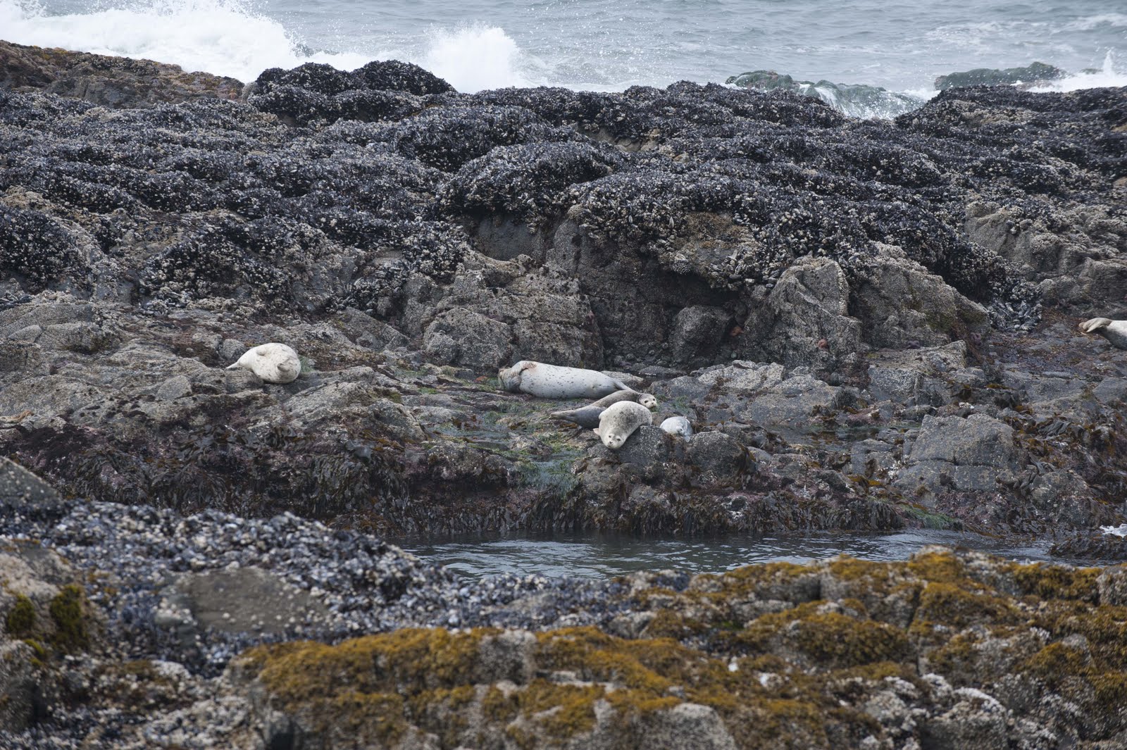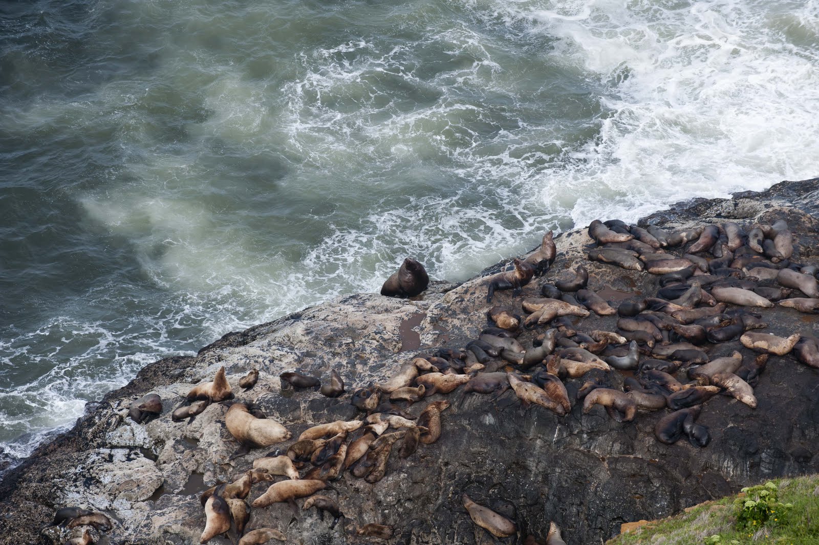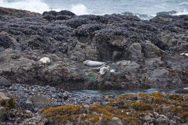 While touring the cave, we met a marine biologist (who also ran a whale watching business a little further up the coast). She suggested we stop a few miles up the coast at Strawberry Hill, where sea lions, with their pups, were on the rocks just off the beach – good photo ops. So – we were off on another adventure to Strawberry Hill. Sure glad the tide was out –