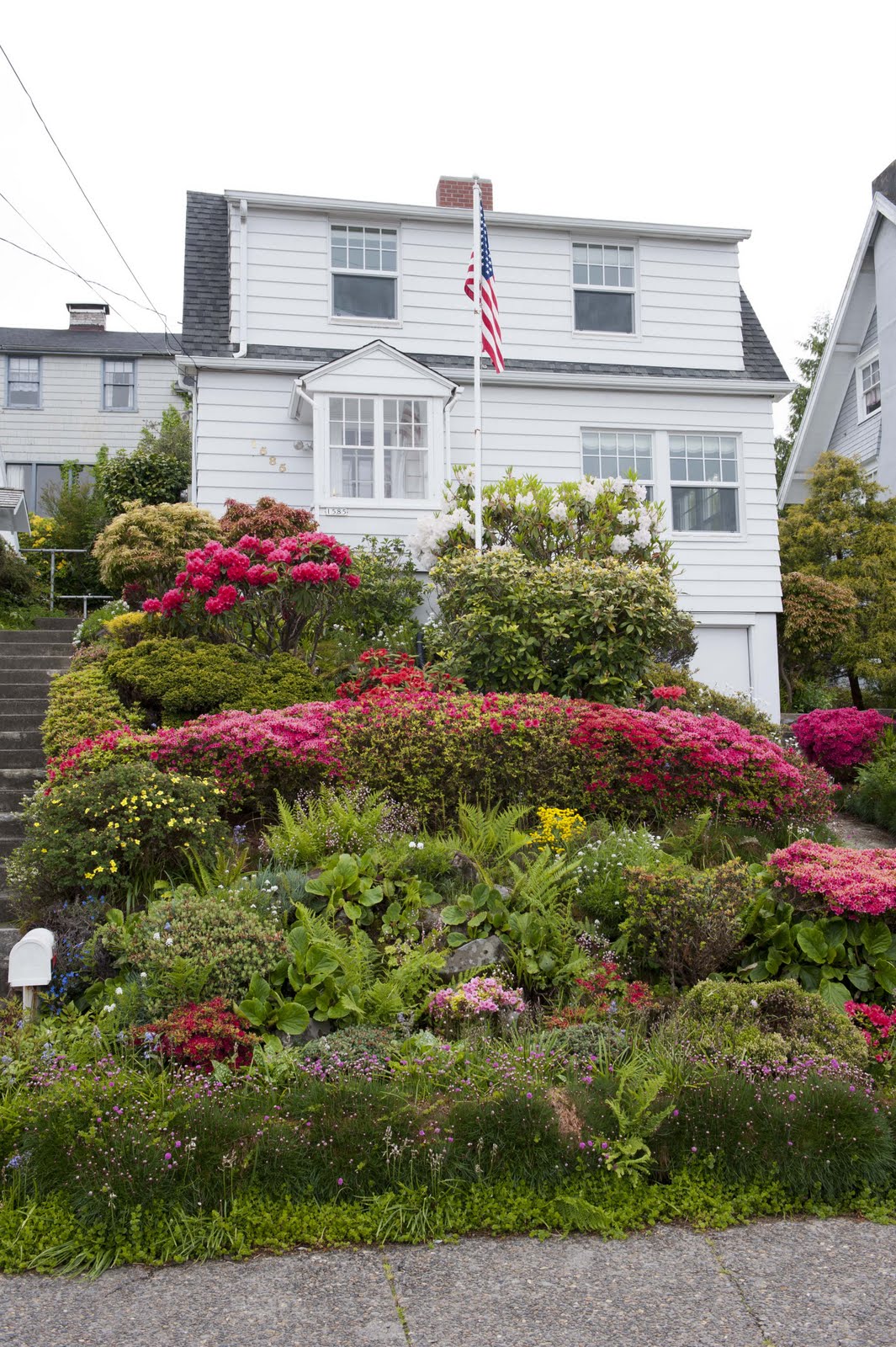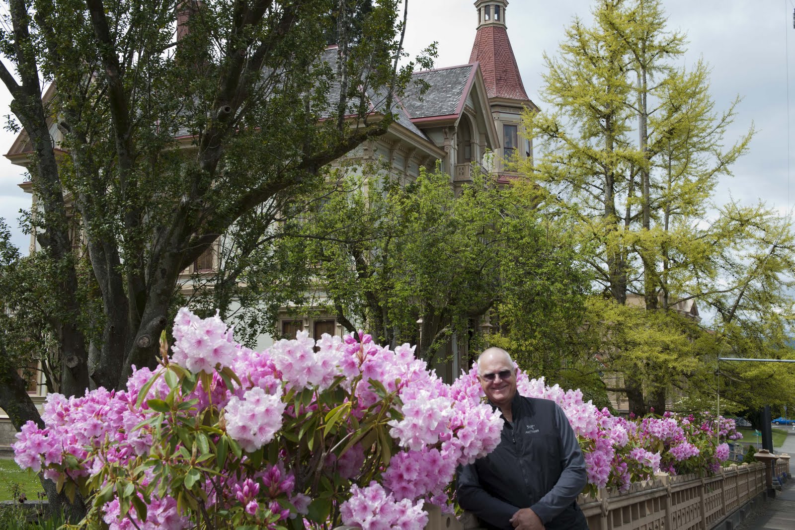It sits on park-like grounds covering an entire city block. The flowering Rhododendron (remember our Rhody Day Celebration in Florence??) are just beautiful up here! And, they are everywhere in the wonderful shades of pink and lavender. Couldn’t resist this picture of Gary’s handsome face enhanced by all these Rhodies!!