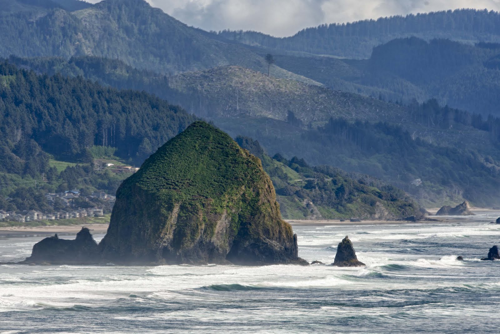 | Haystack Rock is now visible with Cannon Beach in the background. |