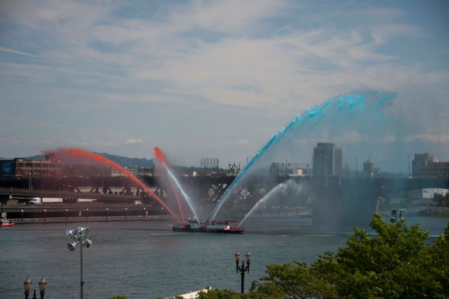 About 3PM, the bridges all started to go up – and there were the Navy ships in all their wonder along with the ‘fire boat brigade’! What a site to see and how much fun –