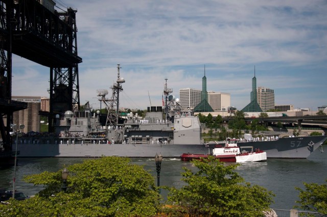 | The USS LAKE CHAMPLAIN getting ready to dock on the Willamette River. |