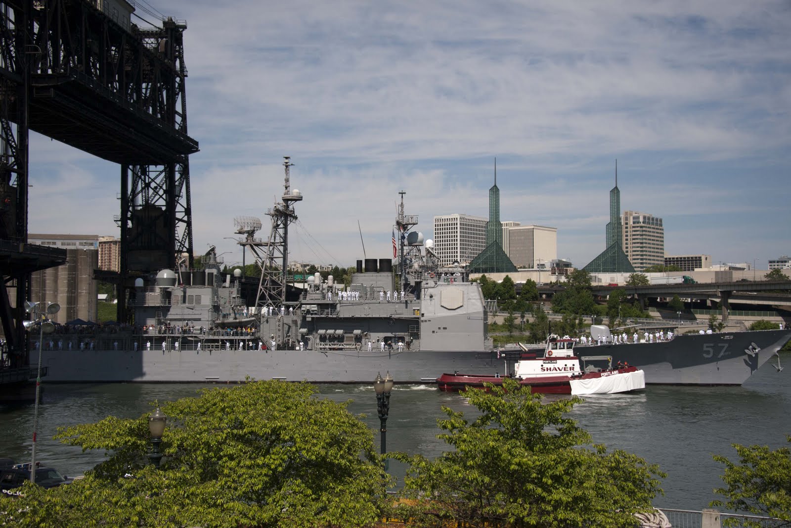 | The USS LAKE CHAMPLAIN getting ready to dock on the Willamette River. |