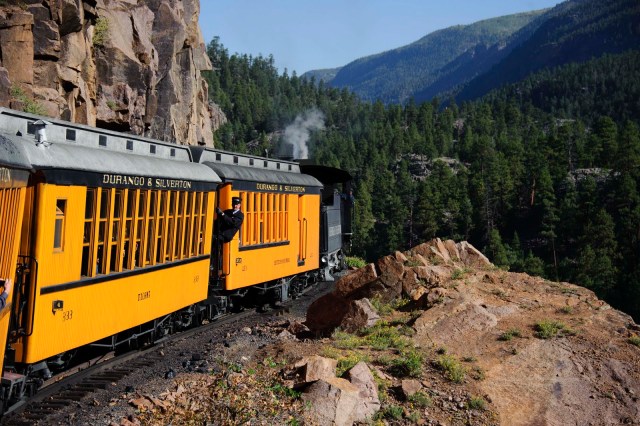 By the early 1950’s, Denver &Rio Grande Western rail freight traffic in Southwest Colorado was reduced to a trickle as shippers started using the new highways. Line after line was scrapped. But, for some reason the PUC denied the request to abandon the Silverton Branch. Thank goodness. After a couple of sales (in 1981 to Bradshaw, a citrus grower, and again in 1997 to the Harpers) and a lot of work on upgrading the rails and equipment by the committed buyers – the Denver & Silverton Narrow Gauge Railroad (D&SNGRR) emerged as a world famous tourist line. Elizabeth rode these rails about 40-something years ago and wanted to relive the experience giving Gary the same thrills. Gary’s camera trigger finger was in constant action!! And, the sights and tree colors were fantastic –