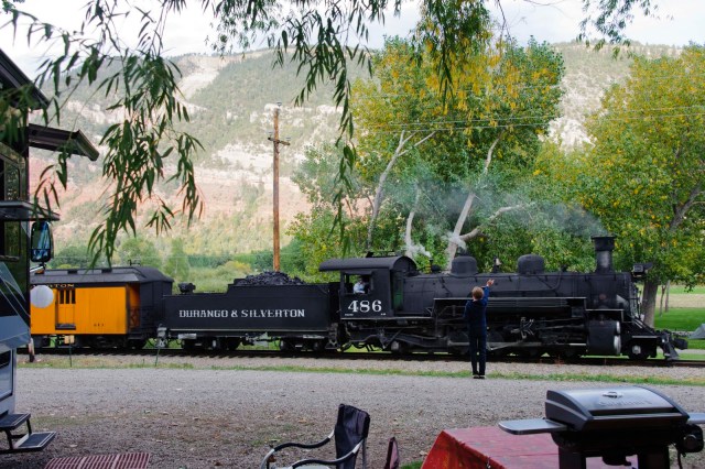In between these events we walked Main Ave., found that ever searched for Family Mexican restaurant (Tacos Nayarit – GREAT food!!) and enjoyed the sights and sounds of our campground as we watched football on Saturday and Sunday;-) Oh – did I mention that our campground is right on the D&SNGRR tracks!! So – we got to wave and enjoy the train four times a day when we weren’t on it;-)