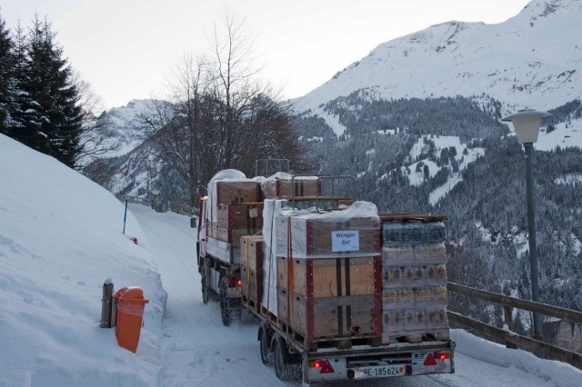 Thought it might be interesting to show you all how a little village up in the mountains prepares for a world famous event like the Lauberhornrennen. A little village was built, within the village, on the main plaza to be used for the evening bib draws and nightly prize ceremonies. AND, all of this has been done since we arrived – which means in FOUR days!! (Remember – this is a village without cars sitting on the side of a mountain.) Also, this plaza is about a block away from our hotel – so to say we are in the middle of things is putting it mildly!!