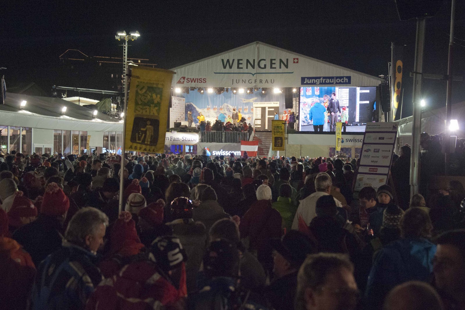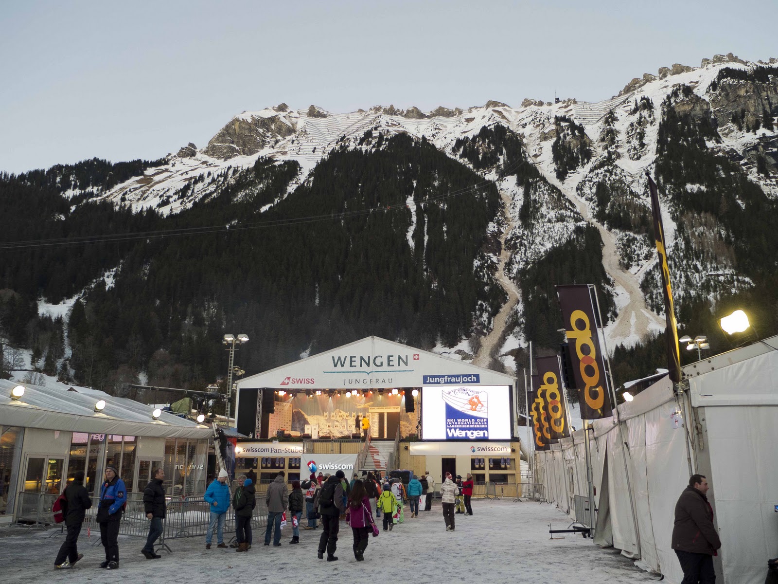 Thought it might be interesting to show you all how a little village up in the mountains prepares for a world famous event like the Lauberhornrennen. A little village was built, within the village, on the main plaza to be used for the evening bib draws and nightly prize ceremonies. AND, all of this has been done since we arrived – which means in FOUR days!! (Remember – this is a village without cars sitting on the side of a mountain.) Also, this plaza is about a block away from our hotel – so to say we are in the middle of things is putting it mildly!!