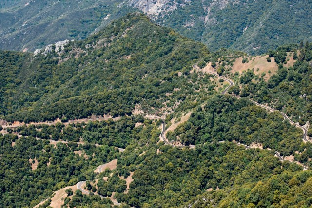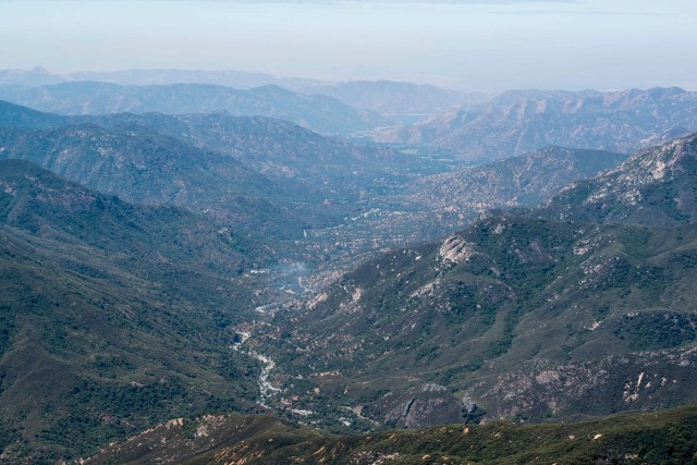| A view of the Kaweah Valley (Magic is parked at the far end of the picture, not too far from the lake) from the top of Moro Rock. You can see the smoke from the ‘burn’ in the middle of the picture. |