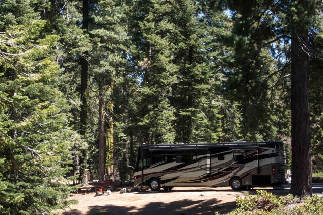 After almost a week in the Valley, we decided we would like to try staying in the park at the entrance to Kings Canyon. So – Magic was packed up and filled to the brim with water, batteries charged and all waste tanks dumped to nothing, as we would be dry camping (no hookups) for the next 5 days in the park campground. It is all worth it – as check out Magic’s new parking spot;-) No one around us and views in every direction –