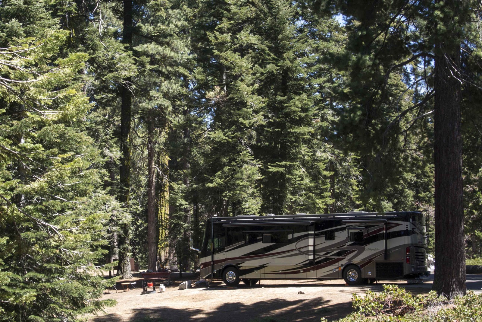 After almost a week in the Valley, we decided we would like to try staying in the park at the entrance to Kings Canyon. So – Magic was packed up and filled to the brim with water, batteries charged and all waste tanks dumped to nothing, as we would be dry camping (no hookups) for the next 5 days in the park campground. It is all worth it – as check out Magic’s new parking spot;-) No one around us and views in every direction –