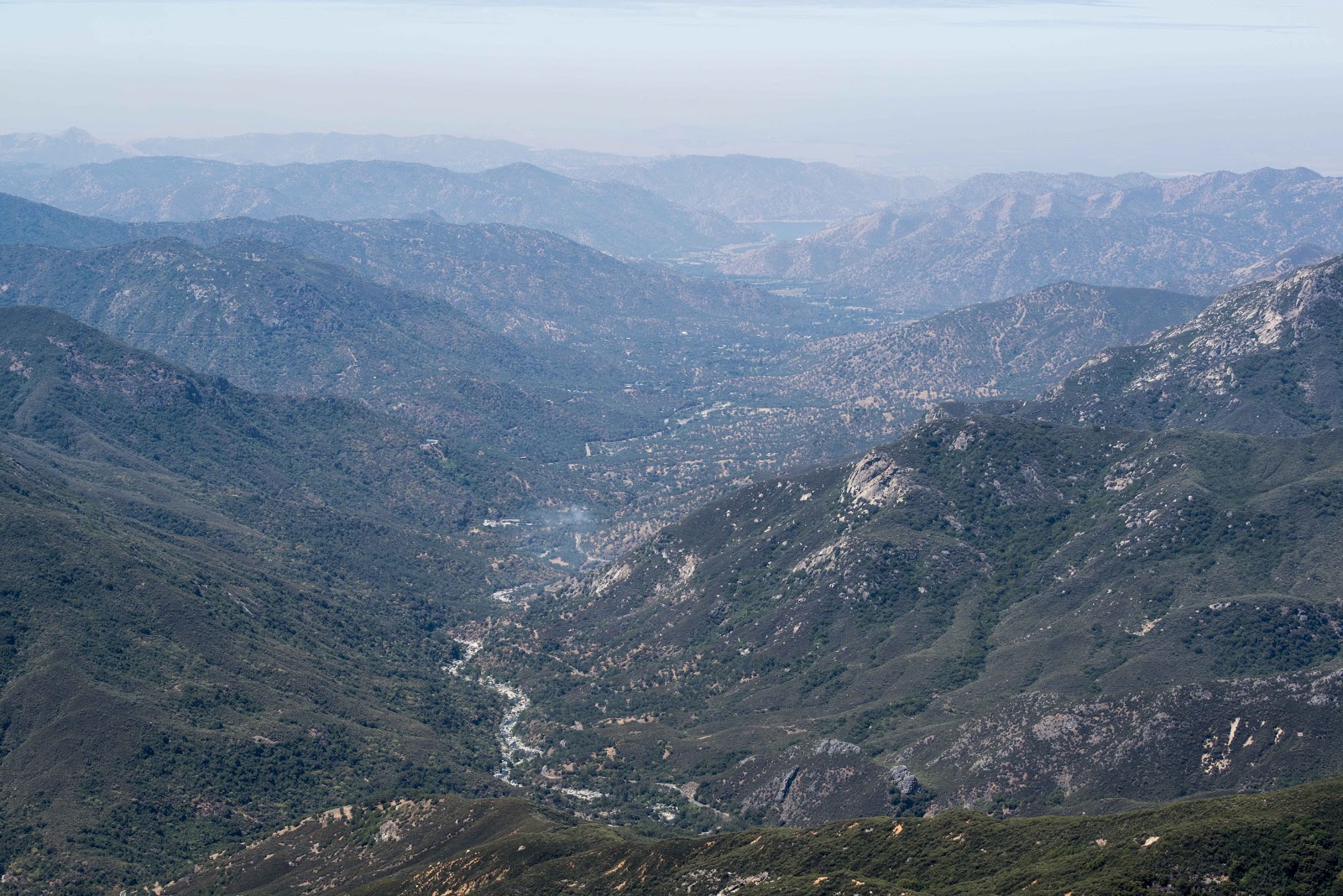| A view of the Kaweah Valley (Magic is parked at the far end of the picture, not too far from the lake) from the top of Moro Rock. You can see the smoke from the ‘burn’ in the middle of the picture. |