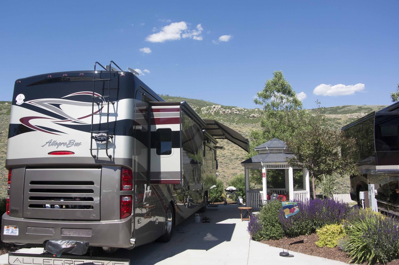 We are movin’ on up! Our reserved spot was waiting for us when we arrived in Park City – the one with the gazebo. We love it –