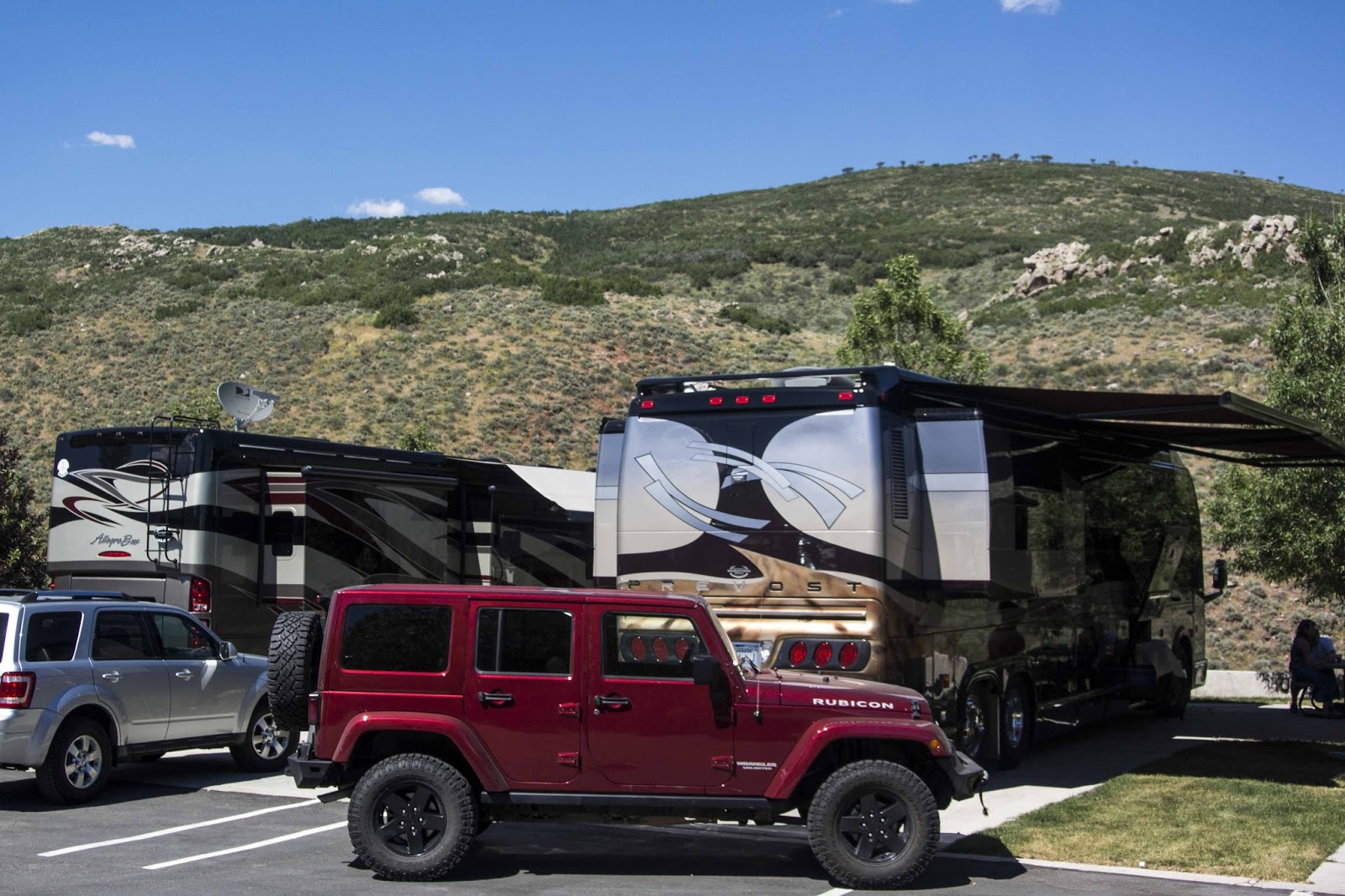 Then – the value of the neighborhood went up significantly when the Prevost pulled in next to us. It took our breath away (picture does NOT do it justice) –