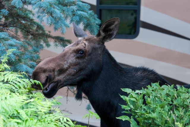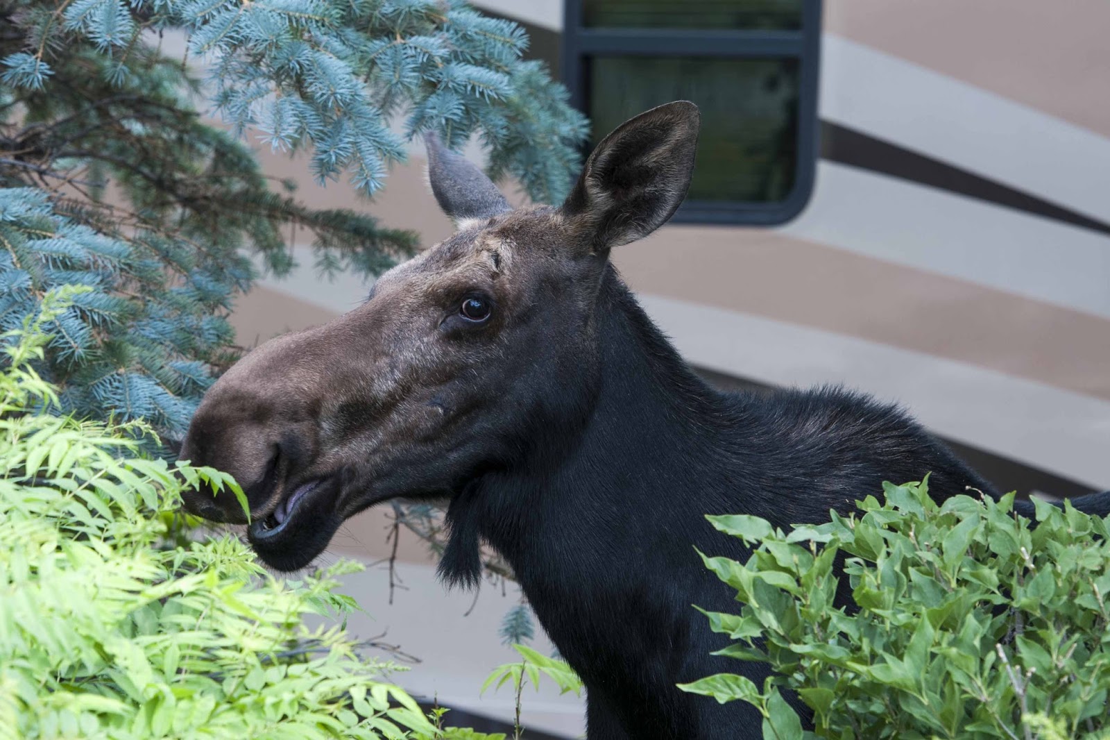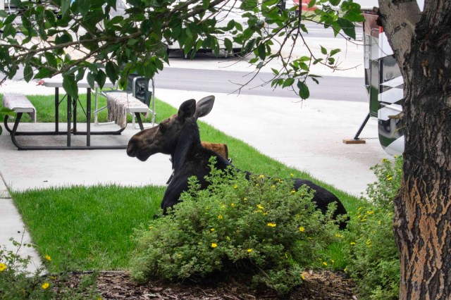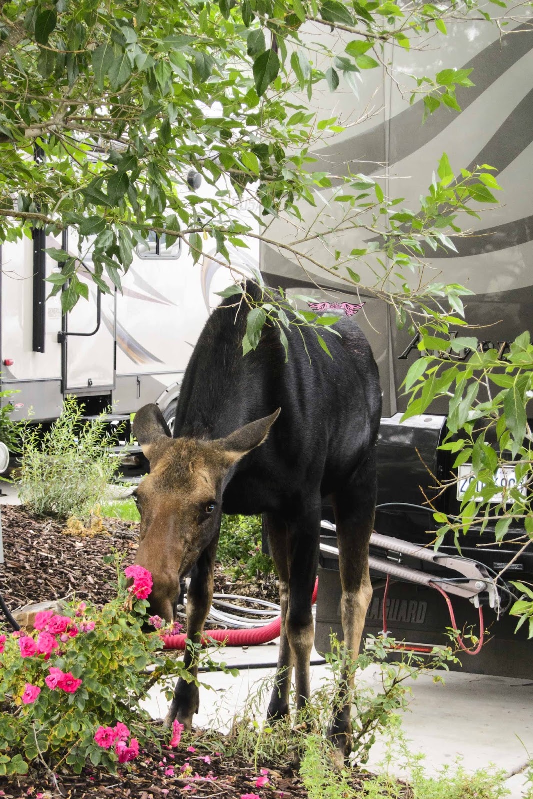 Our young moose was also back this week. She seemed to make herself at home right in the middle of all the coaches here in the PC RV Park!! Most of all she LOVED all the flowers. And, after a little snack of all the pink roses in the park she felt soooo at home she just plunked down to take a little rest –