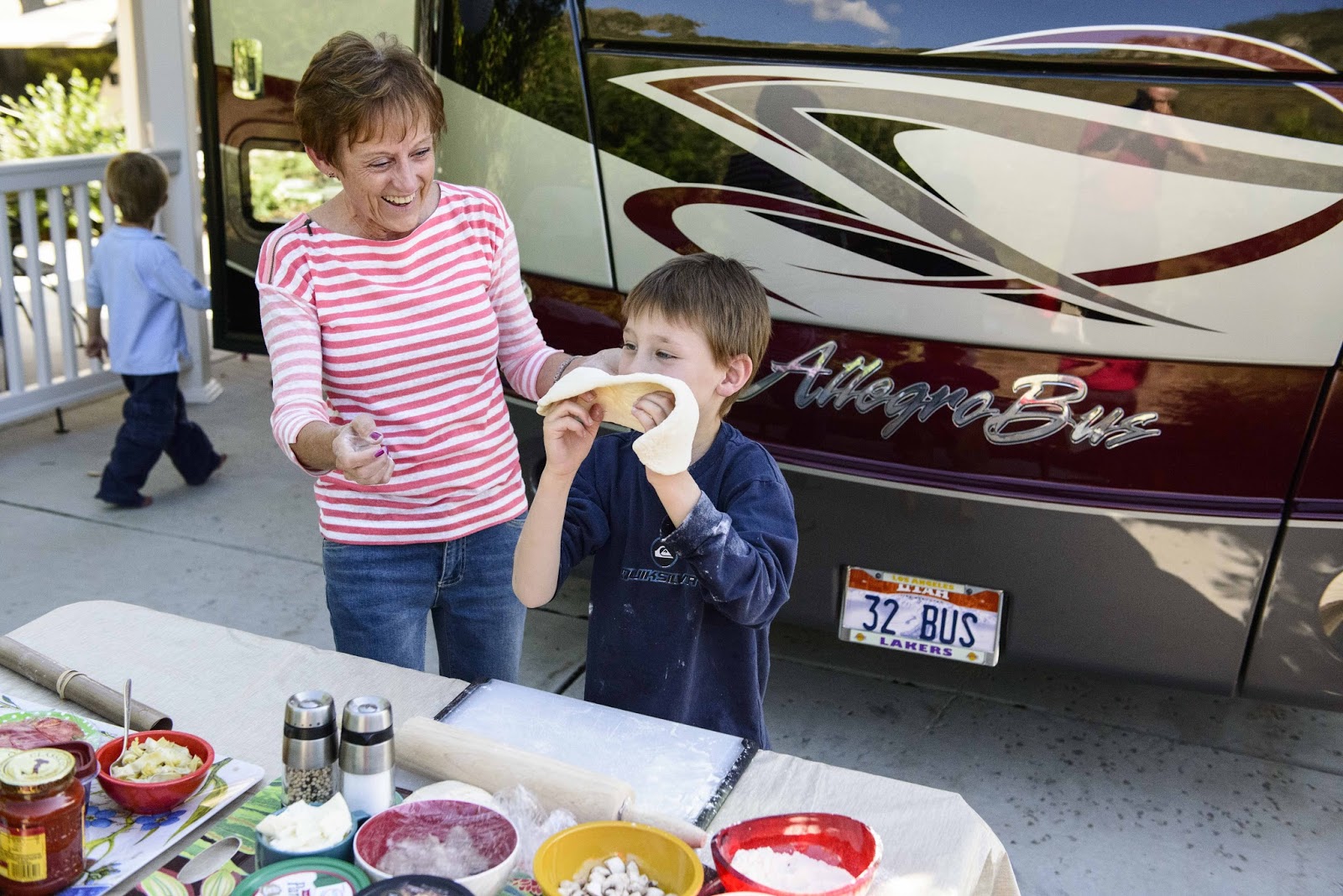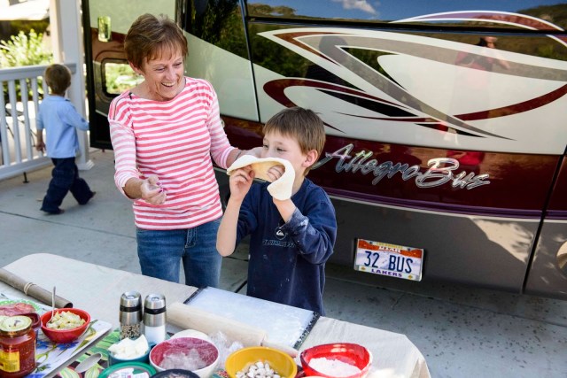 AND – lots of dinners. Back in the land of 2-4-1’s – we have made good use of those coupons. Some dinners have been with old friends here at the Bus – including a pizza party with friends Sarah, Eric, their two boys (6 years and 4 years) and grandparents. Cash, the 6 year old, made all the pizzas!! He really took to it –