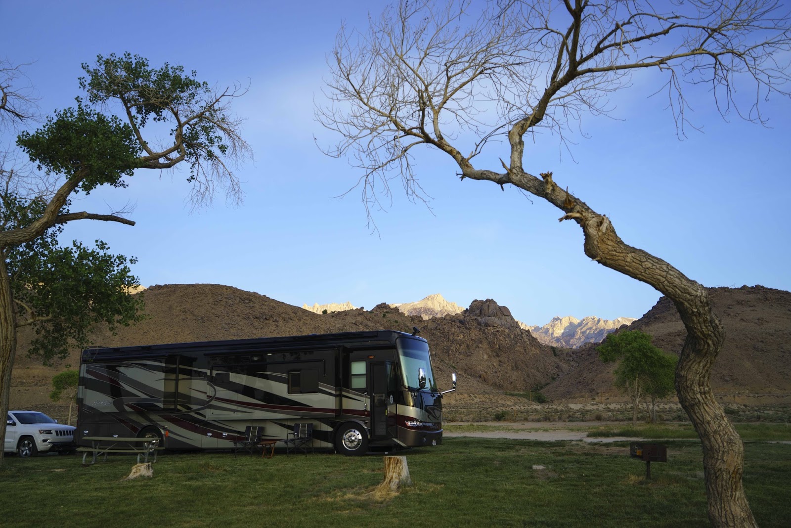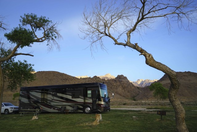 Our spot at Diaz Lake near Lone Pine, with a sunlit Mt Whitney just above Magic’s windshield. |