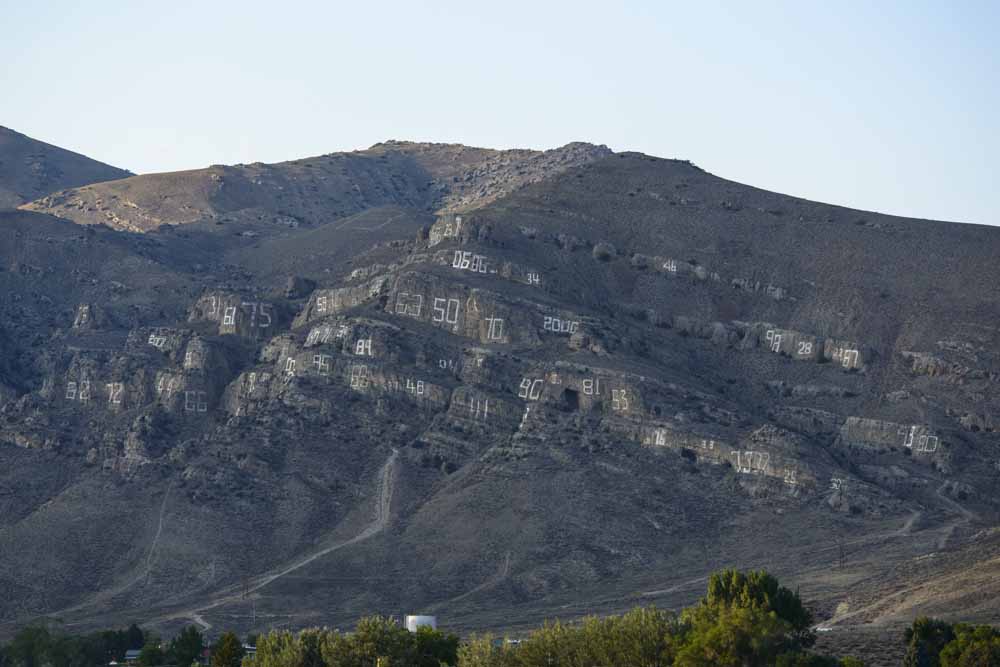 As you can see in the prior post, we did manage to find a very pleasant parking spot for Magic. As we walked around the campground, we noticed the mountain overlooking Arco – and the camp. Despite the fact that local knowledge told us all these ‘notations’ indicated where the snow level was in the noted year – we figured out that each high school graduating class climbed up there and added their year to the mountain. Earliest we could find was ’28! We came to really like this mountain, as it was the biggest personality around. The rest of the area was VAST and FLAT!!!!