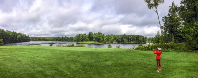 | Does this seem fair? My tee here..E’s tee in the middle of the bridge. We both donated a number of balls attempting to reach that itty bitty green across the lake. |
