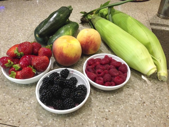 | Our haul from the Market – Yummy fresh fruits and veggies. |