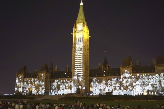 | Same building.. used as the “screen” for a presentation of the history of Canada. |