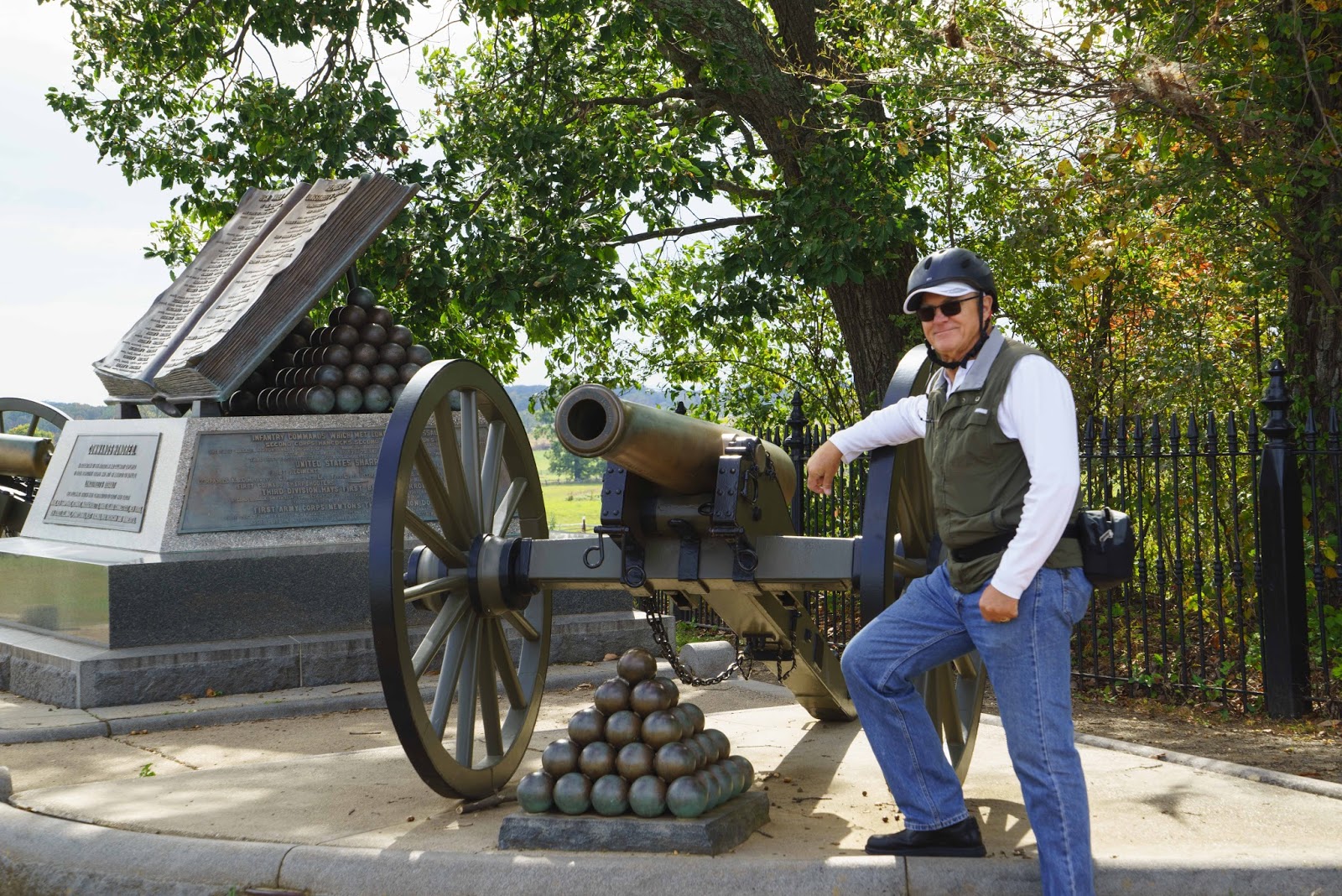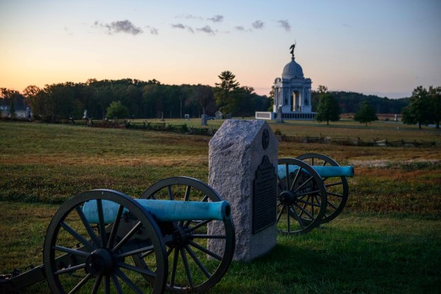 | The Pennsylvania Memorial provides the backdrop to the cannon. All the small memorials note positioning of troops and cannons are in actual firing locations. |