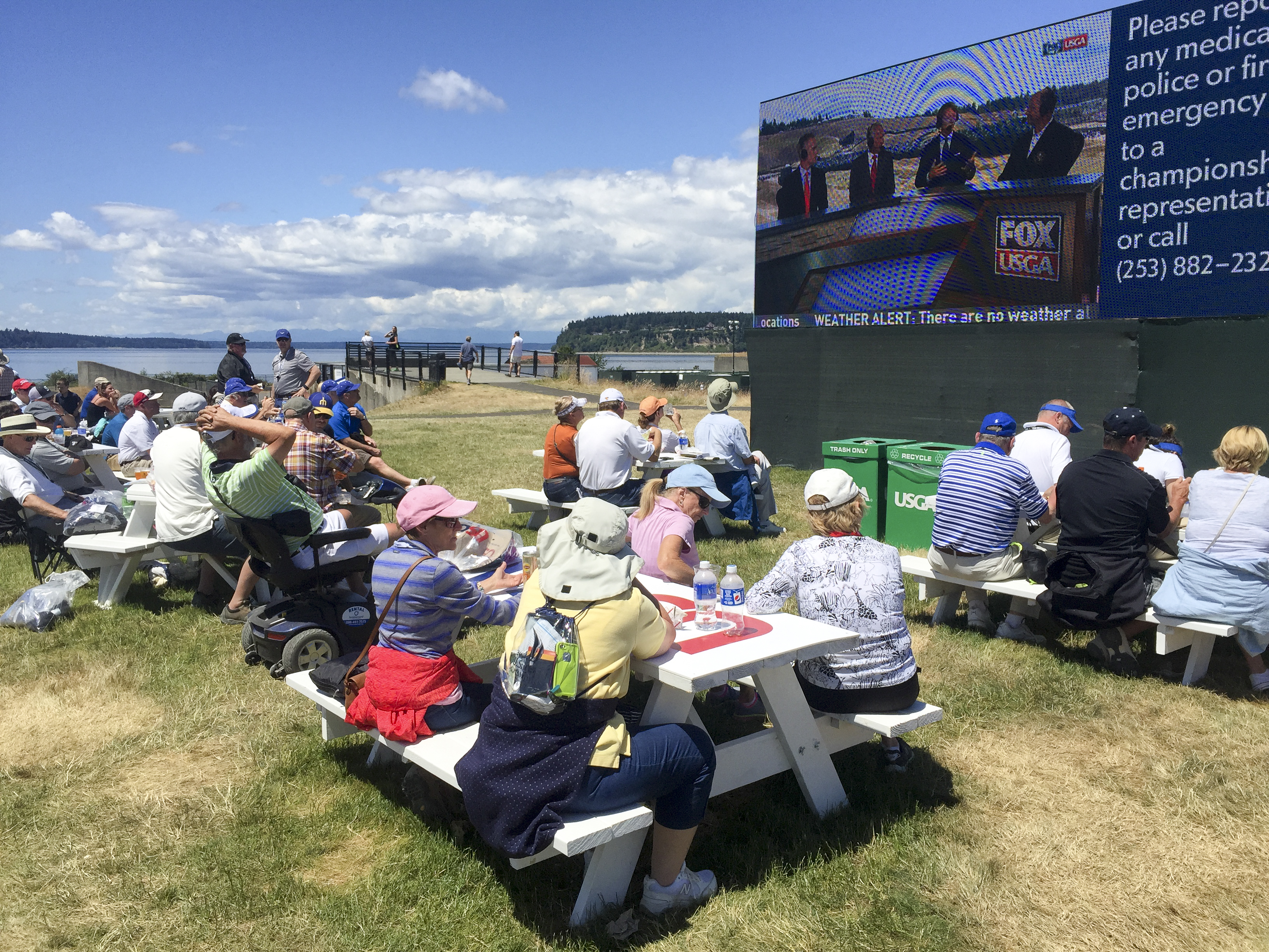 When the morning to afternoon break in golfers hit 18, we hot footed it to the merchandise tent and lunch. Our closet is now full of various pieces of clothing sporting the U.S. Open insignia and logo.