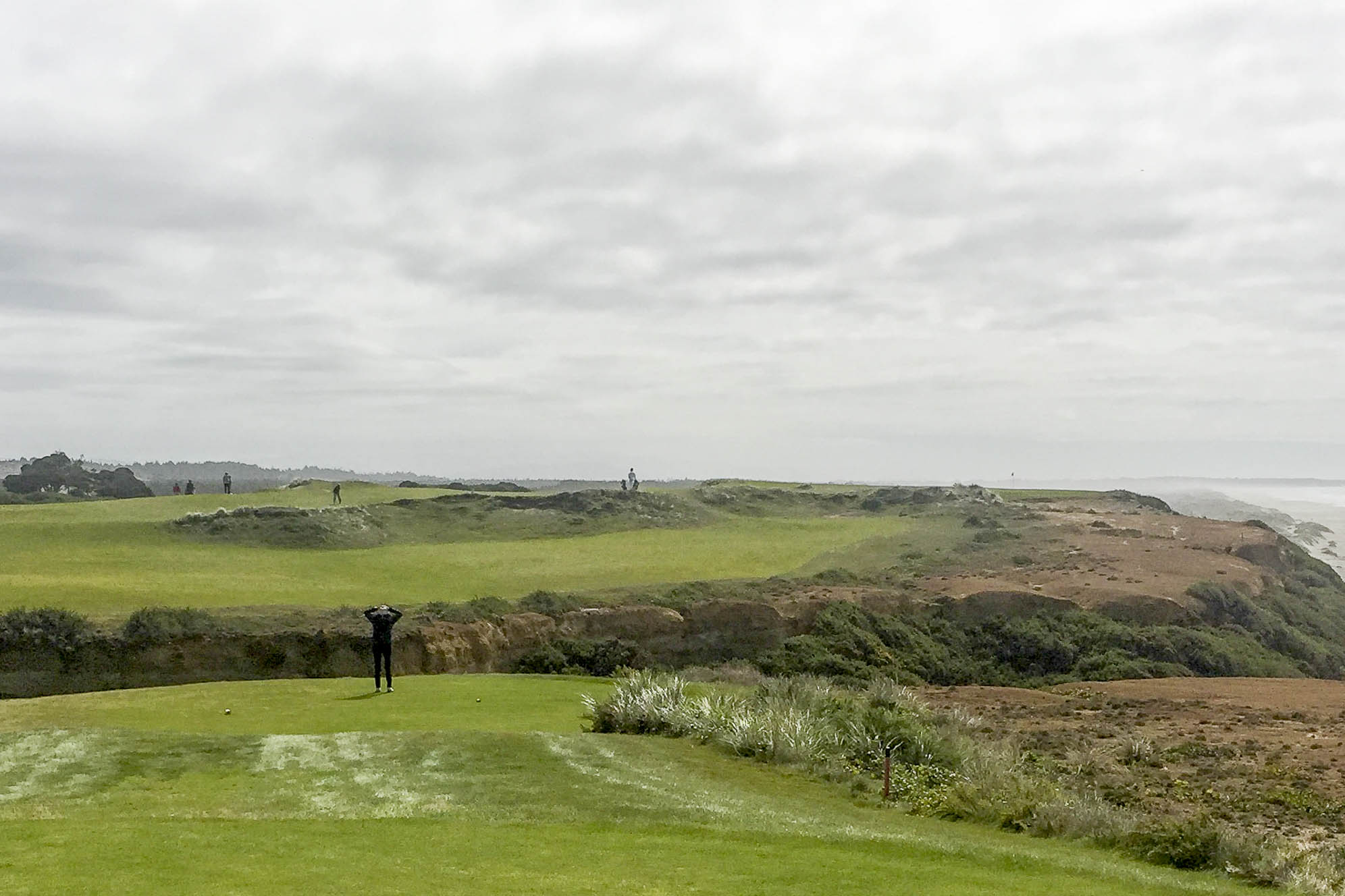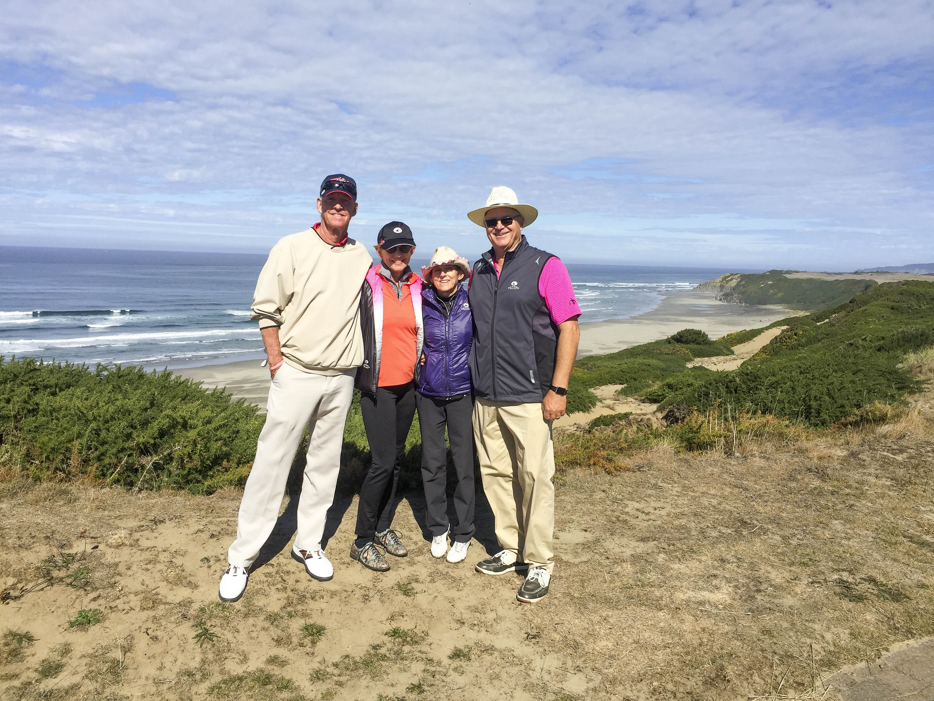 A little windblown and cold but Rebecca, Jim, E and G are having a great time on the first of the Bandon Dunes courses – Bandon Dunes (on the signature 6th hole).