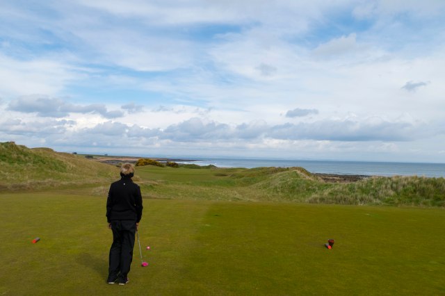 G & E both had caddies for all the rounds of golf played. There was only one problem here at Kingsbarns – E’s caddie was too tall and kept pointing out ‘targets’ or ‘landmarks’ that E could not see because she wasn’t tall enough. At one point he said to aim at a particular bunker – nowhere to be found by E, who told him to get down to her level and find something she could see – –
