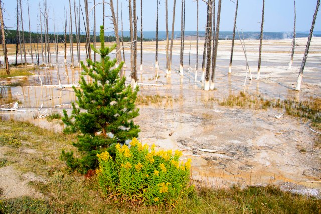 How does the beautiful new growth survive in this environment where the trees in the background died off?