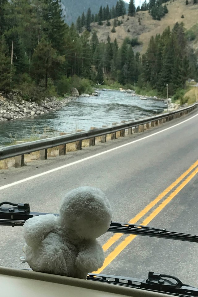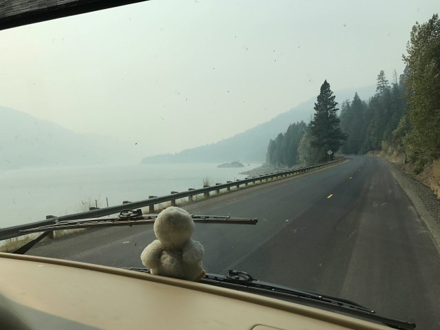 The fires in the west are many, producing large amounts of smoke blanketing the US clear into the middle of country and creating VERY unhealthy air. Below are two pictures taken four days apart showing Quackers’ view from the front of the Bus. The first was before the smoke rolled in and the second is after – –