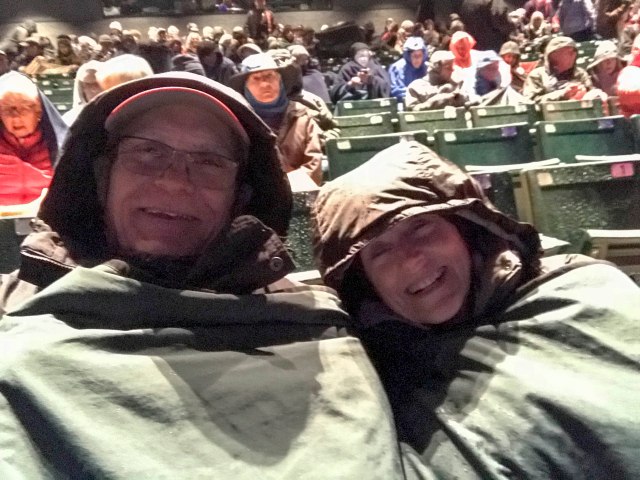 Fortunately, we were prepared for the evening from our Deer Valley concerts – as this play was on the outside Elizabethan stage and it POURED – –