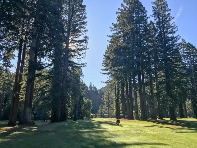 Beautiful course – but, Gary ricocheted off of a lot of redwoods here.
